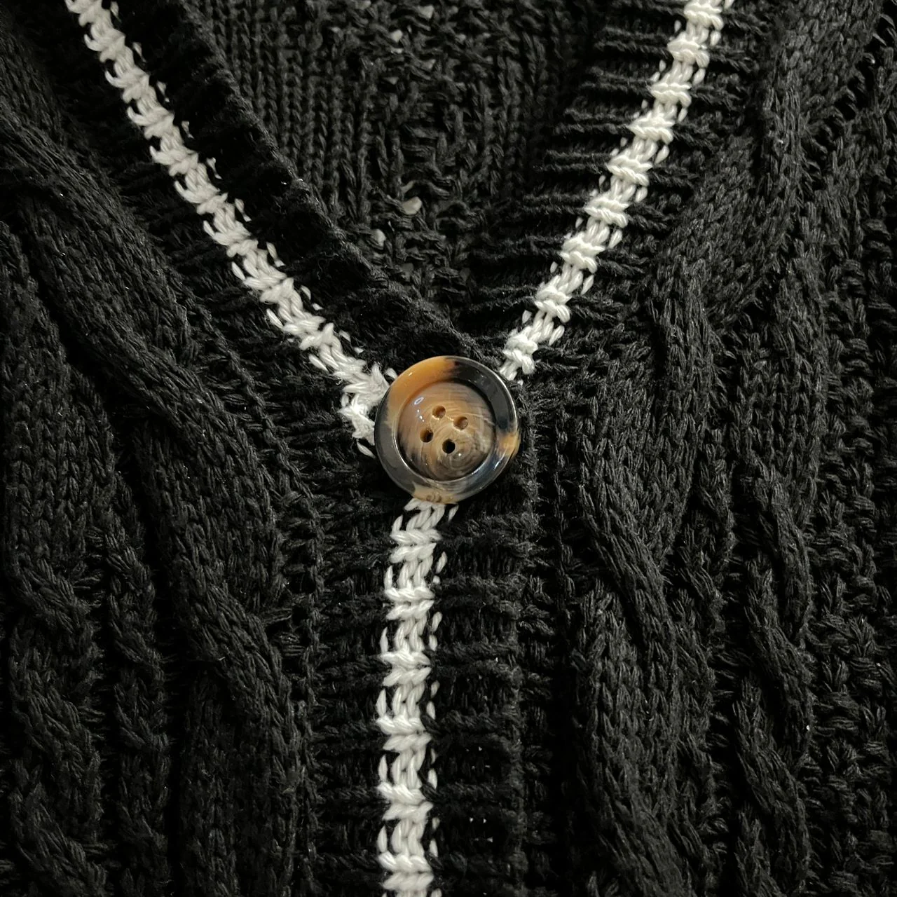 After washing, reshape the cardigan while damp and lay it flat to dry. Do not tumble dry, bleach, or iron directly on the fabric.