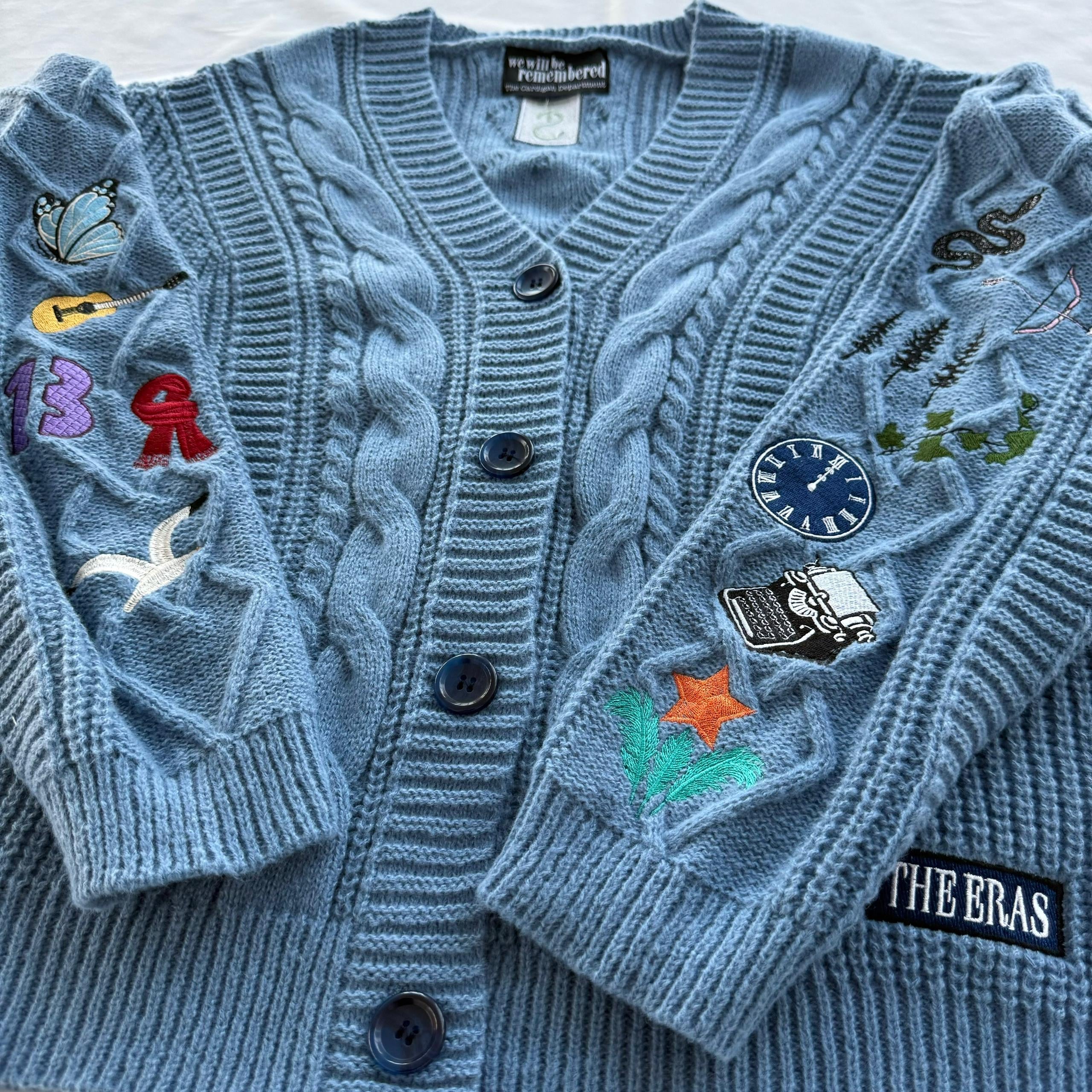 Each patch on the cardigan represents a different era — capturing the colors, moods, and symbols that define each moment in the journey. With the new Showgirl patch woven in, this cardigan becomes an even richer timeline of reinvention, resilience, and sparkle.